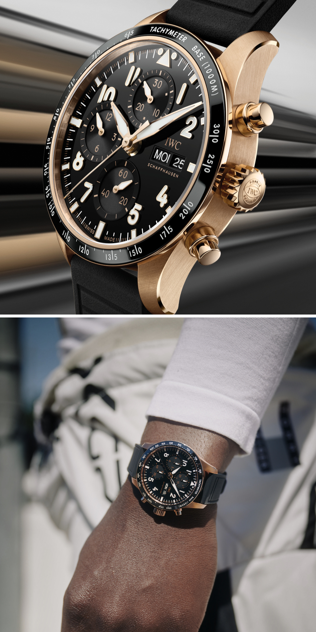 The Pilot’s Watch Performance Chronograph 41 impresses with a case and crown crafted from solid 18-carat 5N gold. The precious metal is combined with a black lacquer dial and a black ceramic bezel with a tachymeter scale. In F1® THE MOVIE, this elegant sports watch is worn by the main character, rookie driver Joshua Pearce, portrayed by actor Damson Idris.