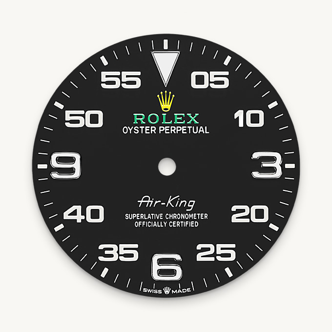 The Air-King dial features a distinctive black dial with a combination of large 3, 6 and 9 numerals marking the hours and a prominent minute scale for navigational time readings. It bears the name Air-King in the same lettering that was designed specially for the model in the 1950s.