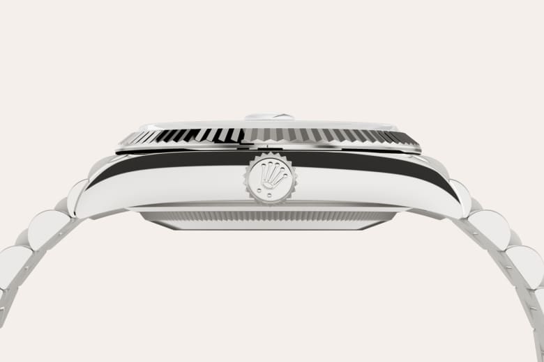 The Rolex fluted bezel is a mark of distinction. Originally, the fluting of the Oyster bezel had a functional purpose: it served to screw the bezel onto the case helping to ensure the waterproofness of the watch. It was therefore identical to the fluting on the case back, which was also screwed onto the case for waterproofness, using specific Rolex tools. Over time, the fluting became an aesthetic element, a genuine Rolex signature feature. Today the fluted bezel is a mark of distinction, in gold on this Day-Date 36.