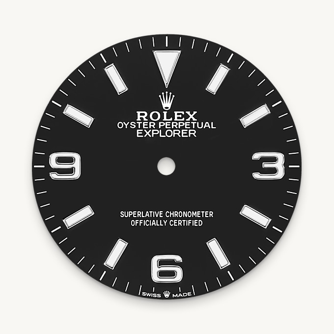 The dial is the distinctive face of a Rolex watch, the feature most responsible for its identity and readability. The Explorer model’s characteristic 3, 6 and 9 numerals are filled with a luminescent material emitting a long-lasting blue glow, like the hour markers and hands. Like all Rolex timepieces, the Explorer 36’s dial is designed and manufactured in-house, largely by hand to ensure perfection.