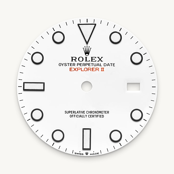 The Explorer II features a date display, an additional orange 24-hour hand and a fixed bezel with 24-hour graduations, enabling day to be distinguished from night. It became the watch of choice for speleologists, volcanologists and polar explorers. Its hour markers and hands feature a highly-legible Chromalight display with long-lasting blue luminescence.