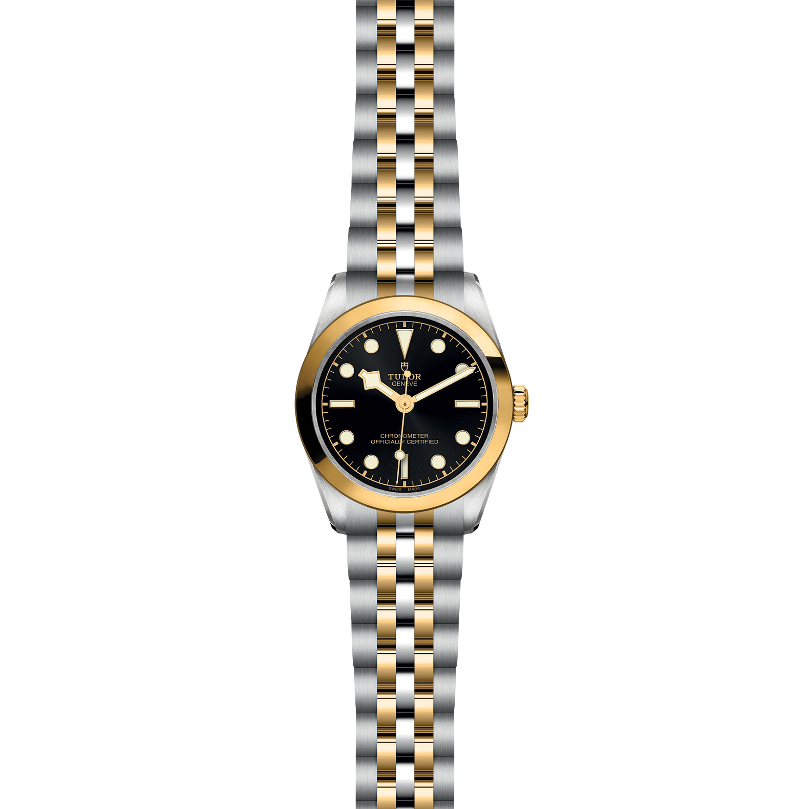 Screw-down winding crown with the TUDOR rose in relief. Steel covered by a 0.1mm yellow gold cap