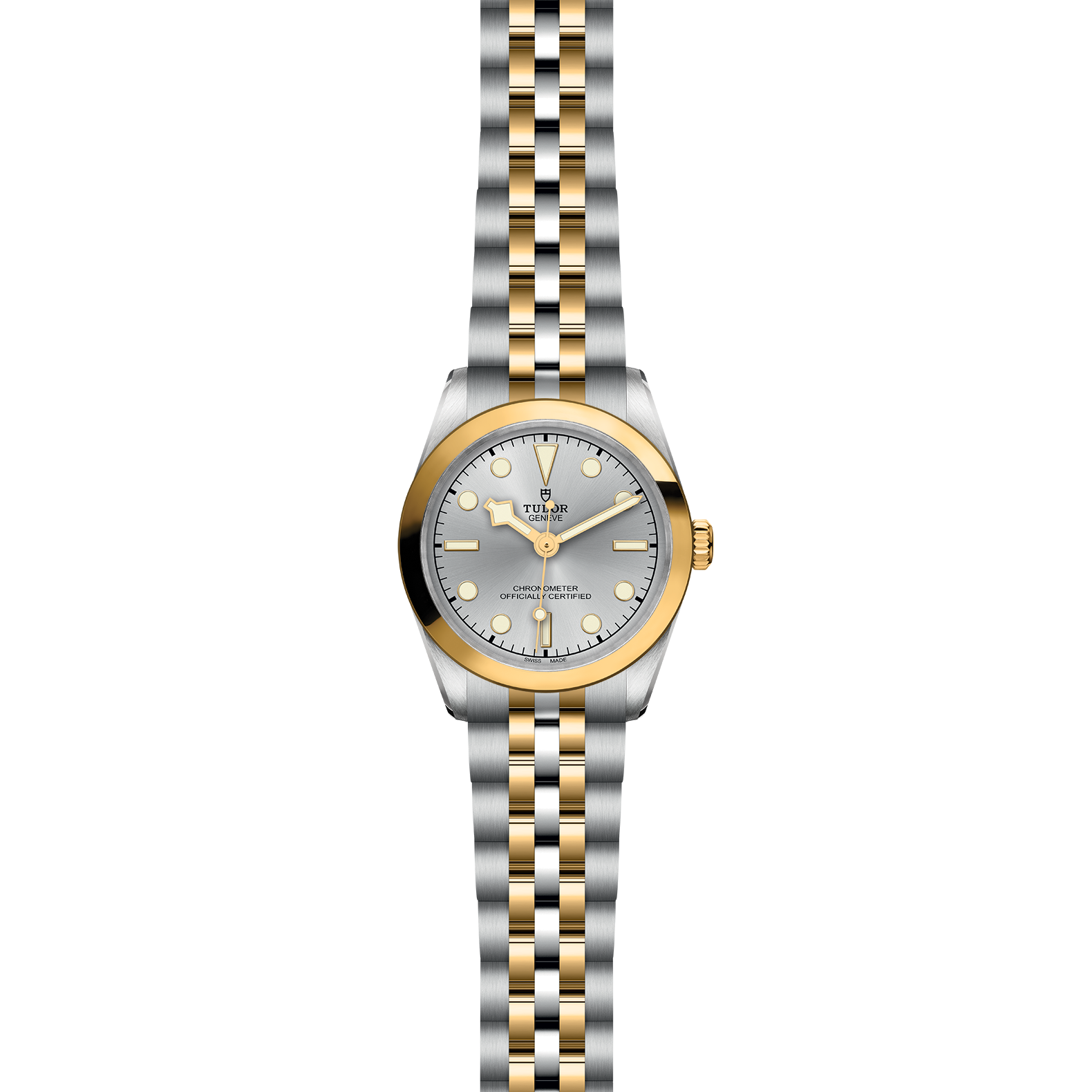 Screw-down winding crown with the TUDOR rose in relief. Steel covered by a 0.1mm yellow gold cap
