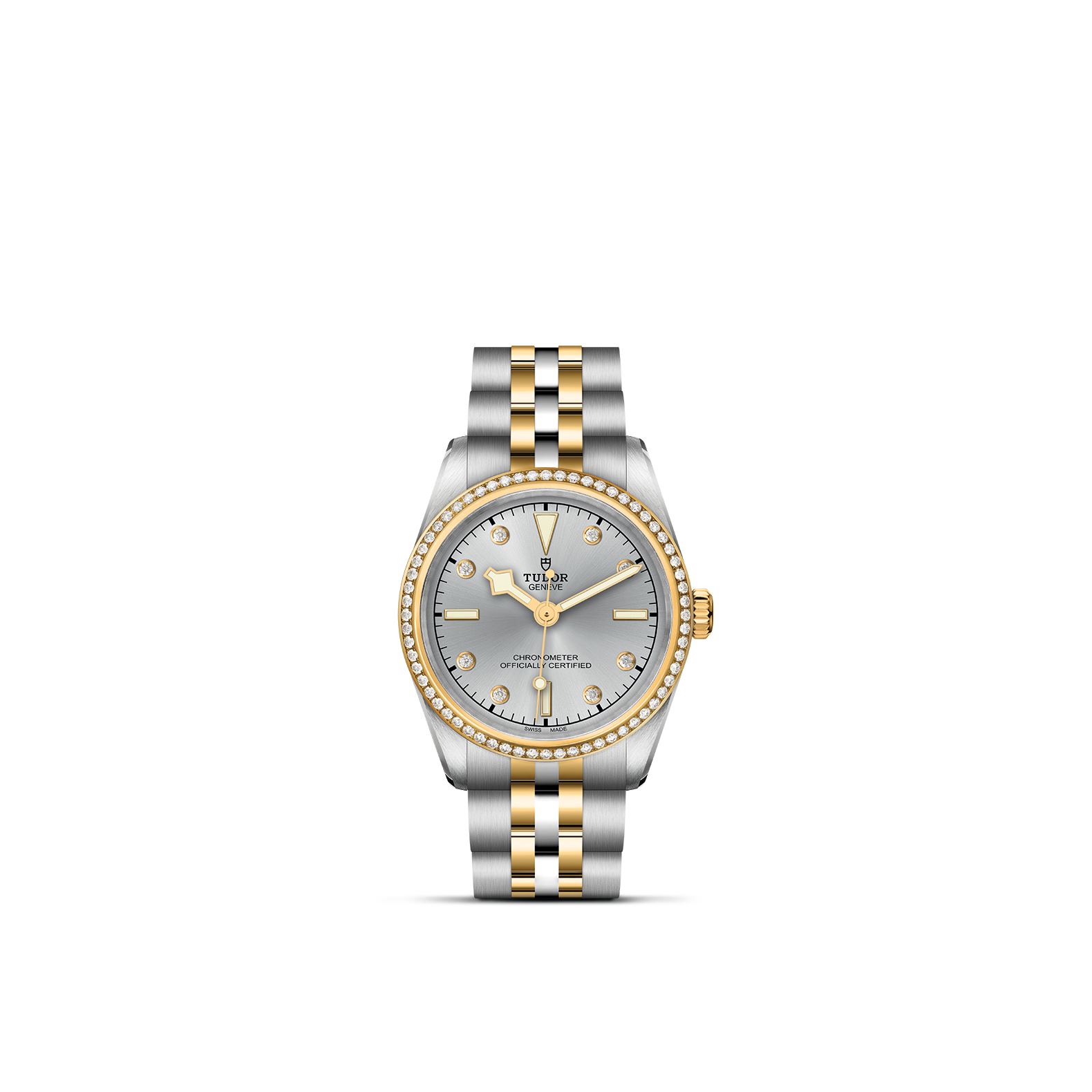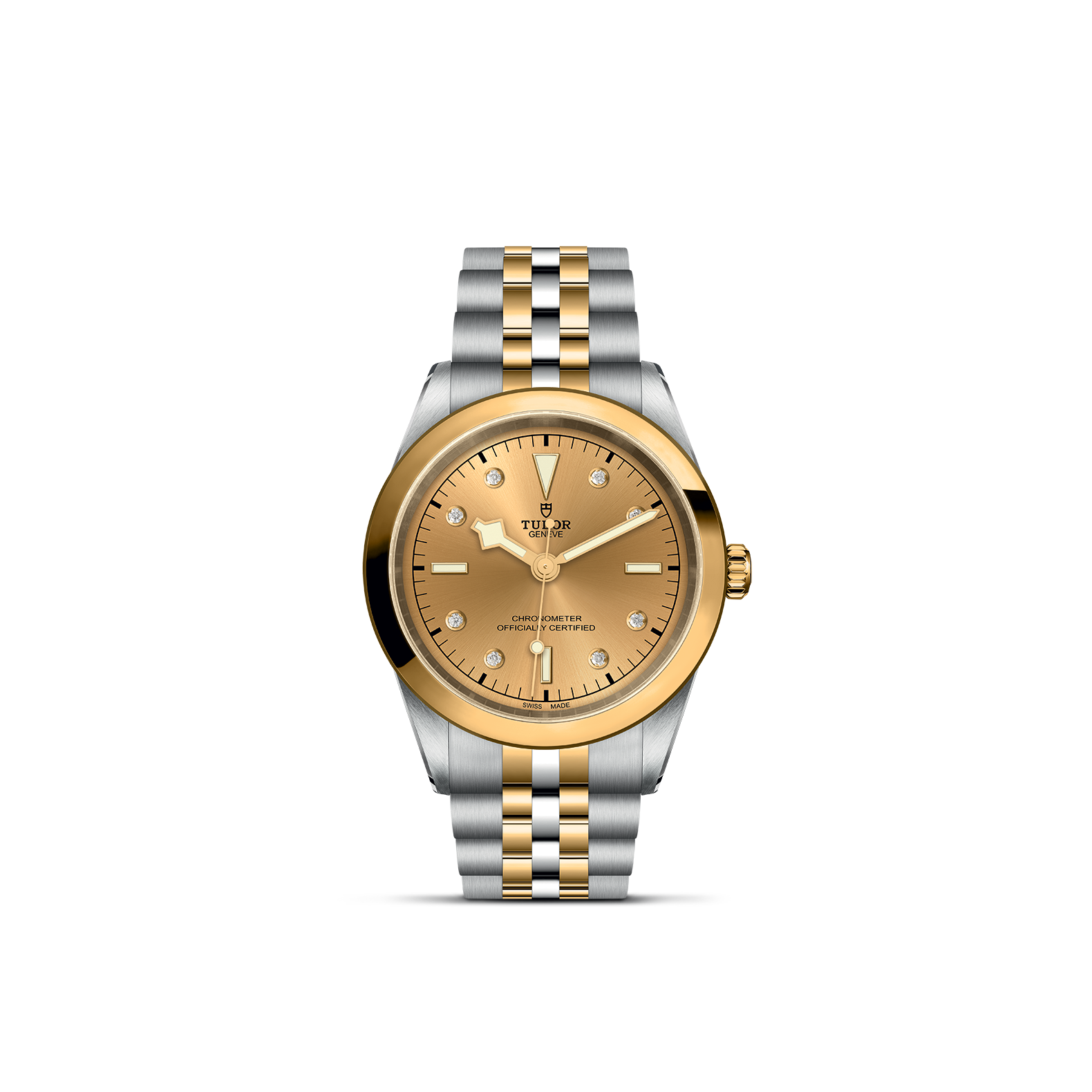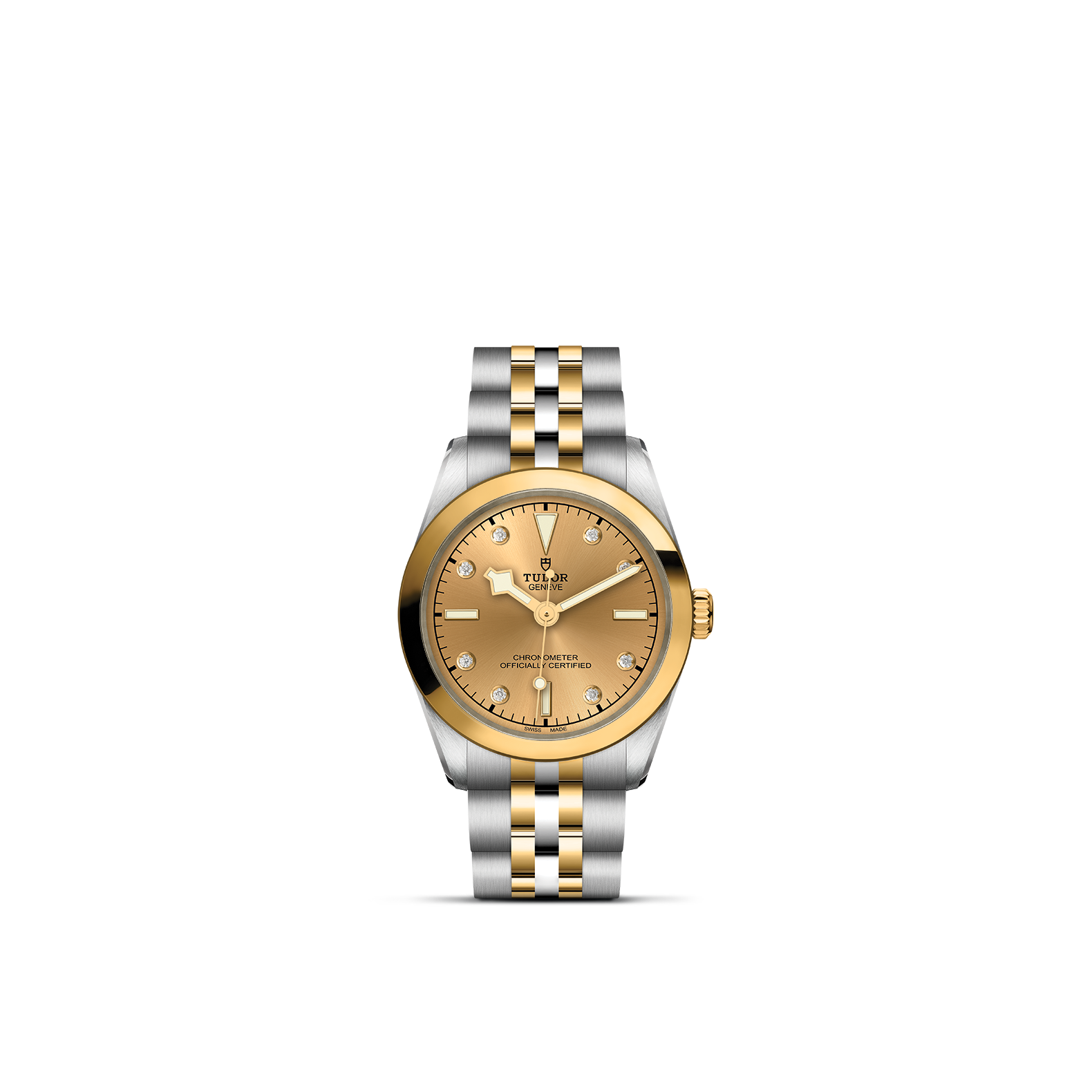 Screw-down winding crown with the TUDOR rose in relief. Steel covered by a 0.1mm yellow gold cap