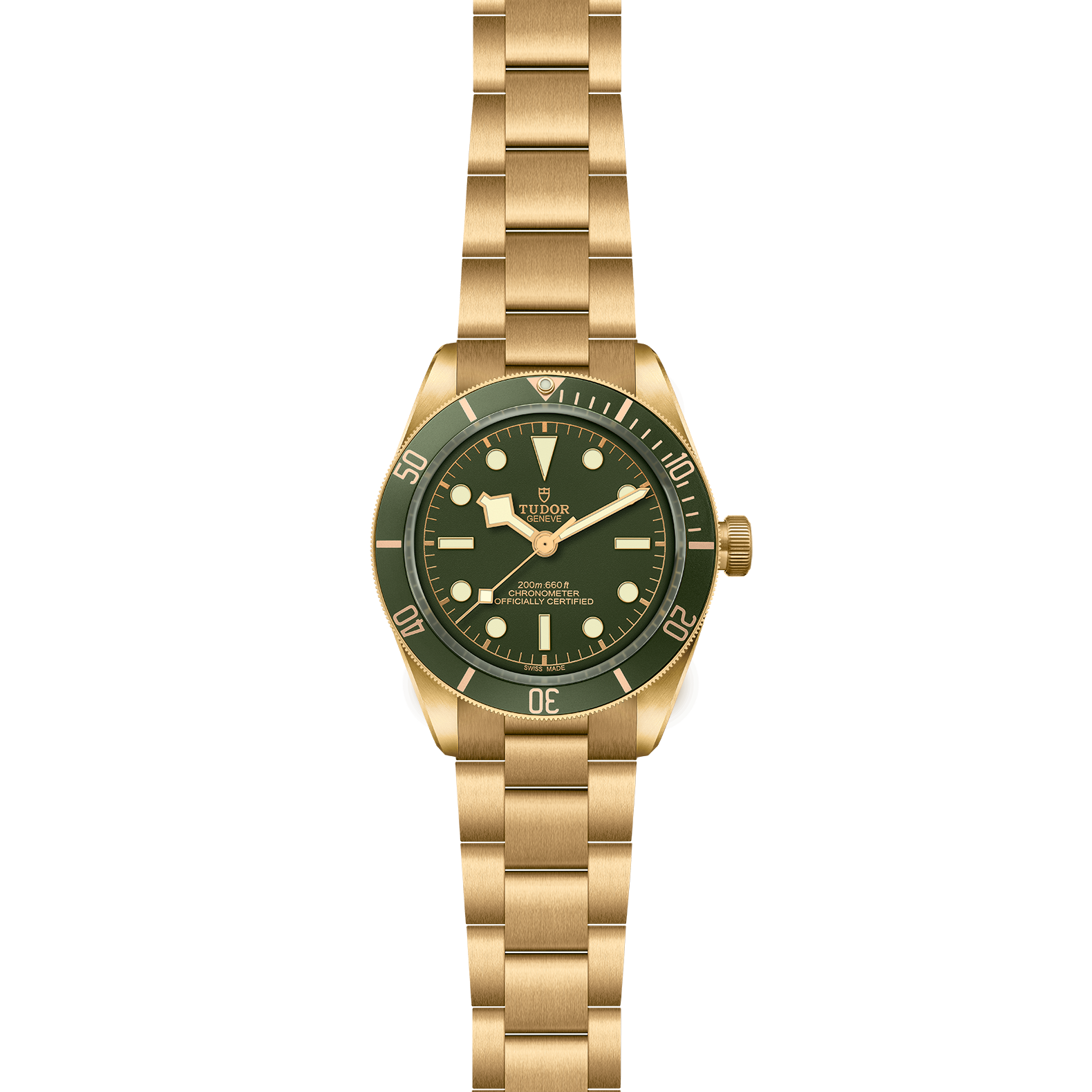 18 ct yellow gold screw-down winding crown, with the TUDOR rose in relief with circular satin-brushed 18 ct yellow gold winding crown tube