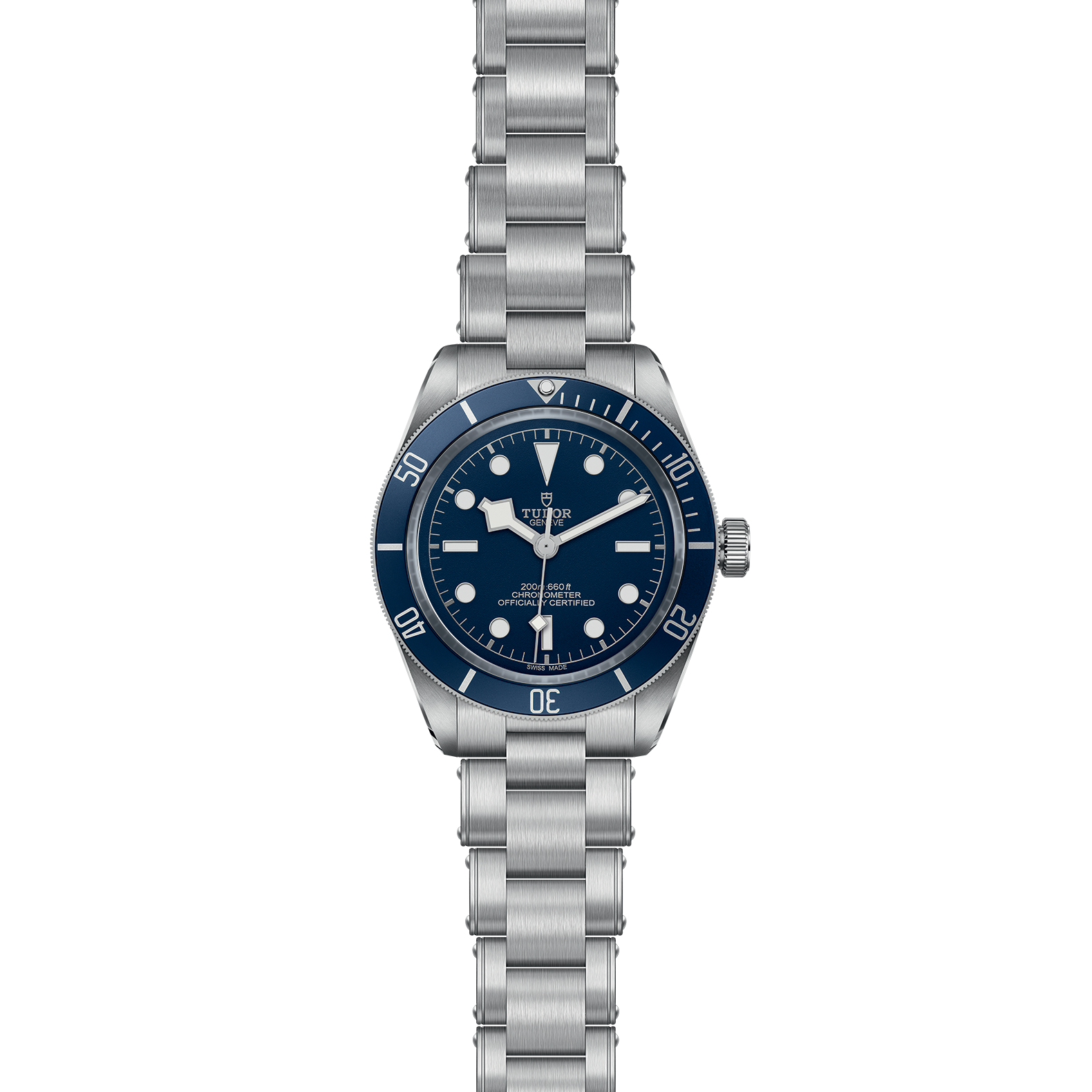 Steel screw-down winding crown, with the TUDOR rose in relief, with circular satin-brushed steel winding crown tube