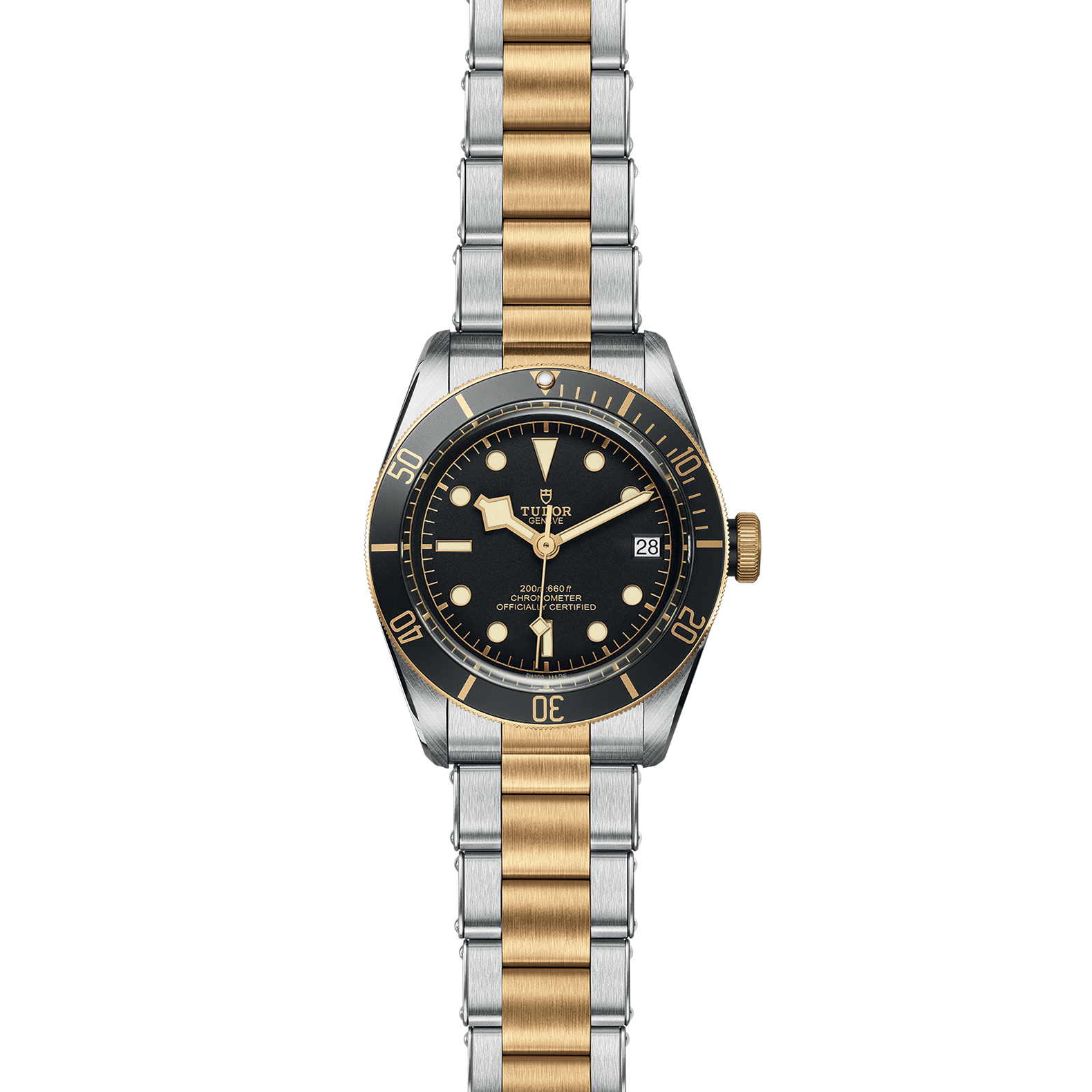 Screw-down winding crown, with the TUDOR rose engraved and lacquered in black, with black anodised aluminium winding crown tube. Steel covered by a 0.3mm yellow gold cap