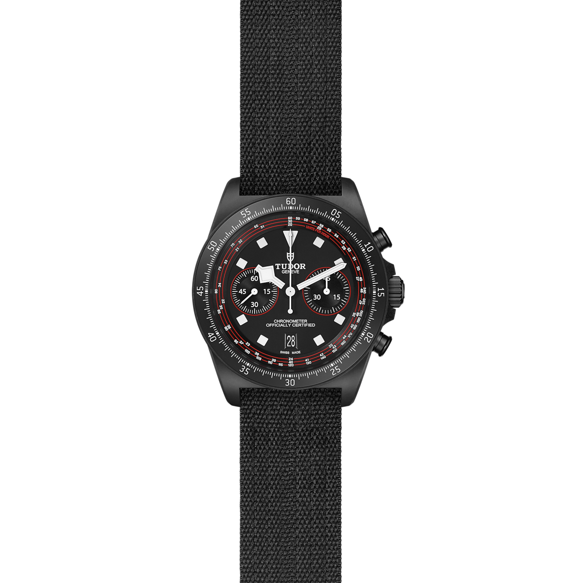 Black, matt, red accents on the chronograph counters and tachymeter scale