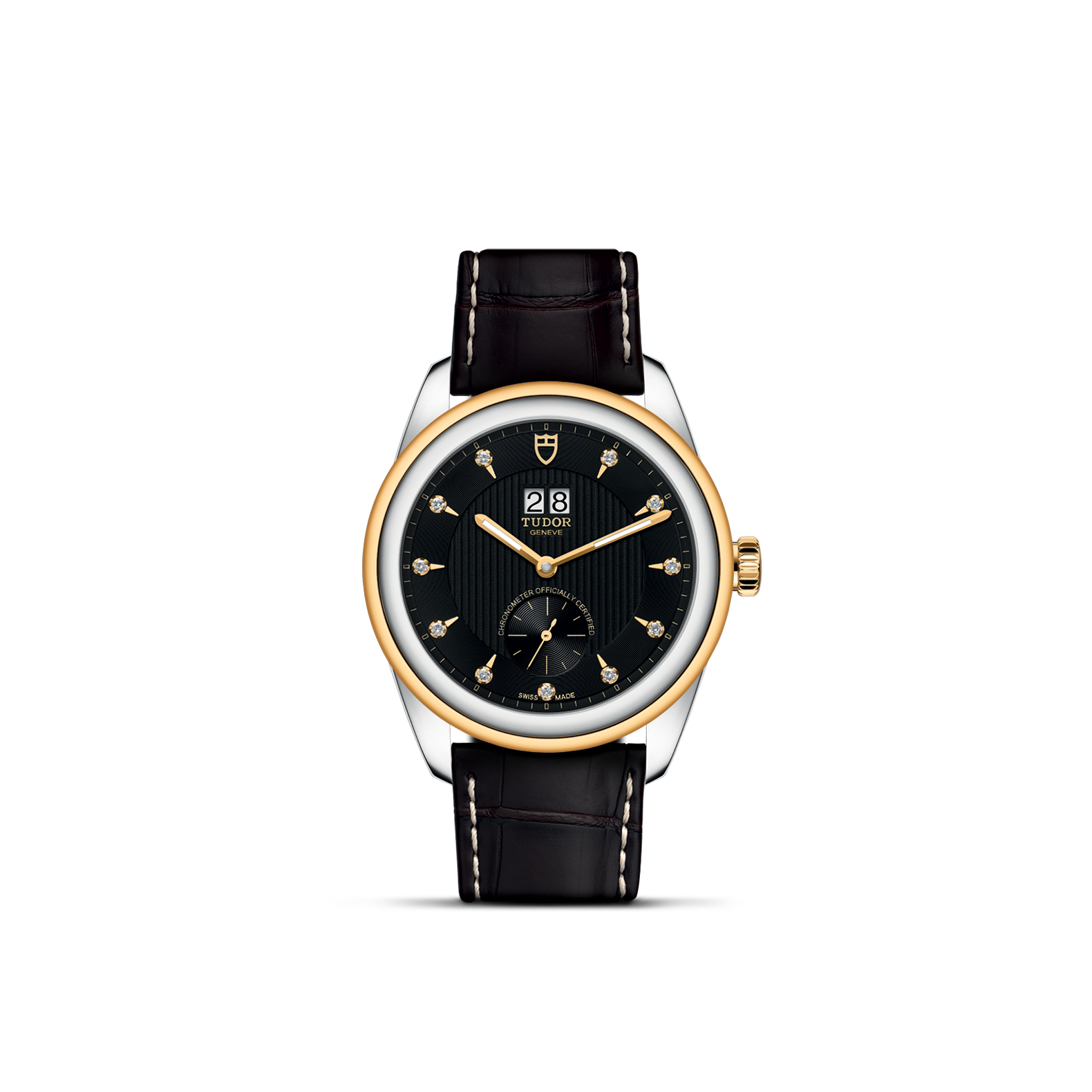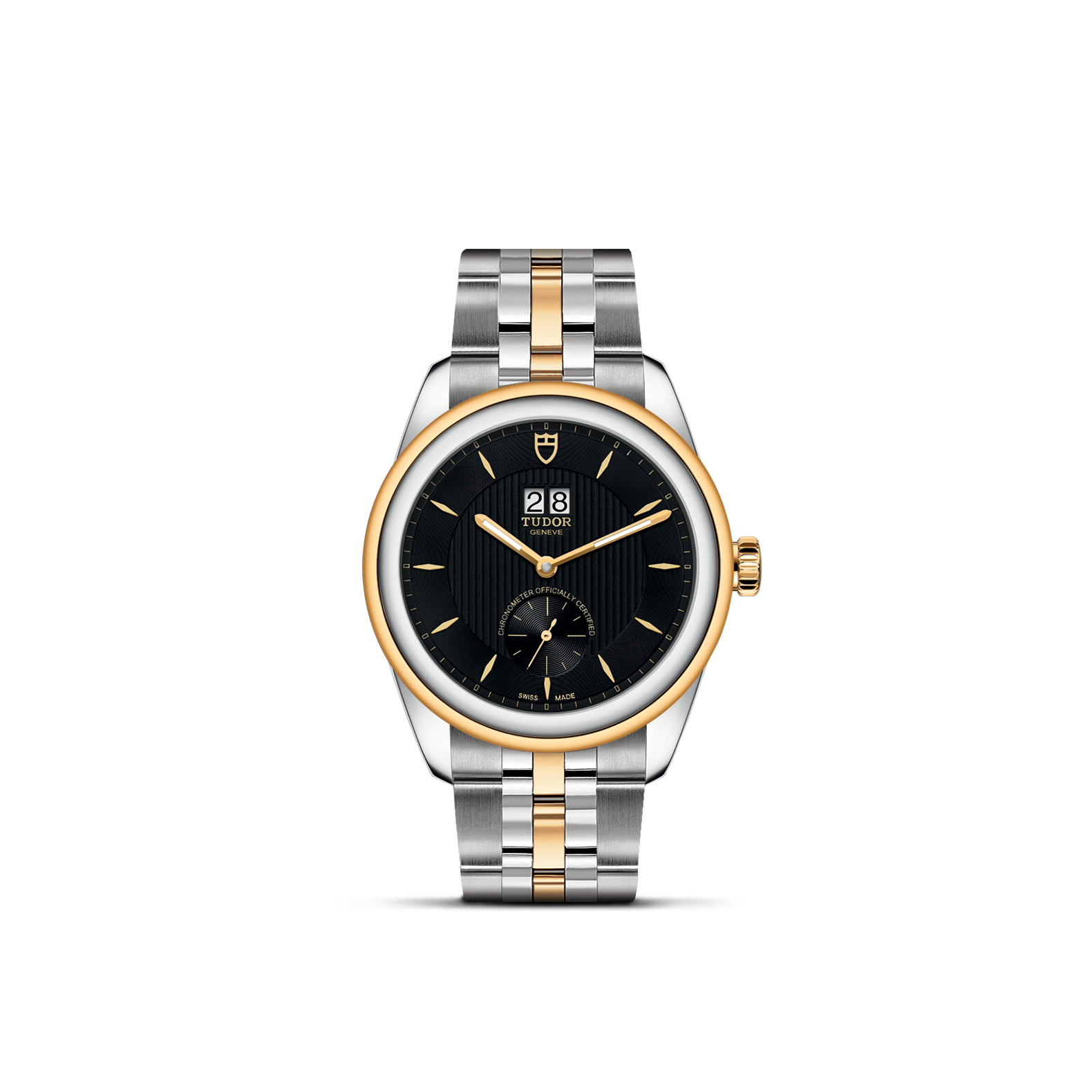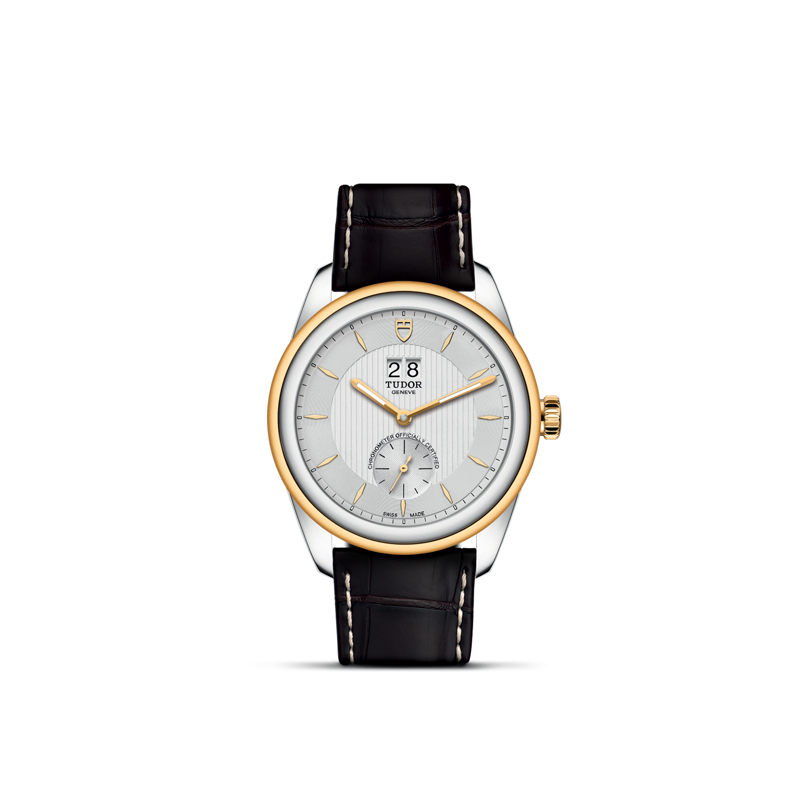旋入式上链錶冠,饰以帝舵表标志;由钢芯及0.3毫米黄金包金制成