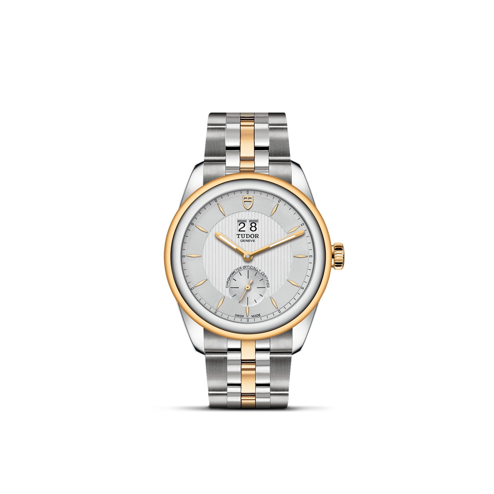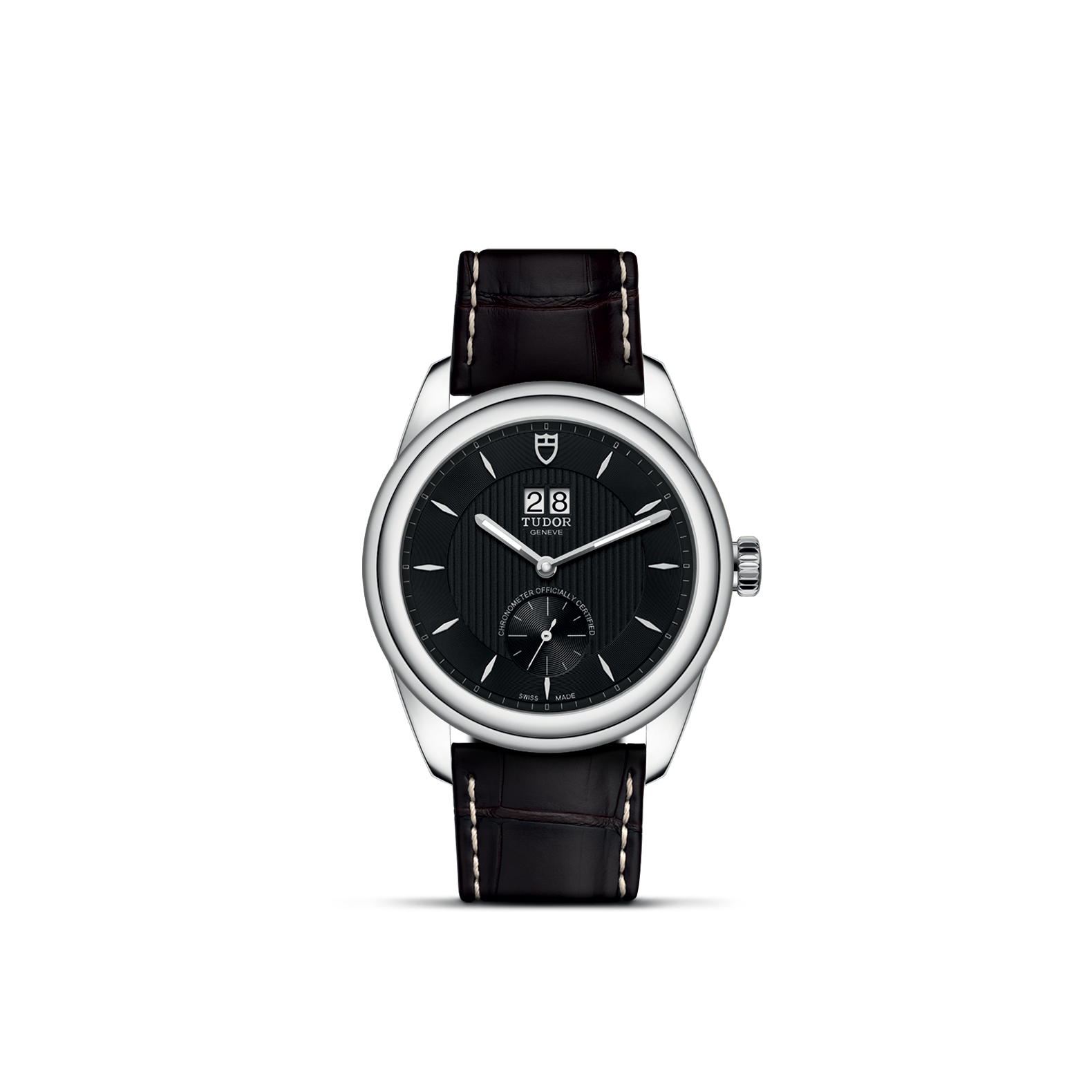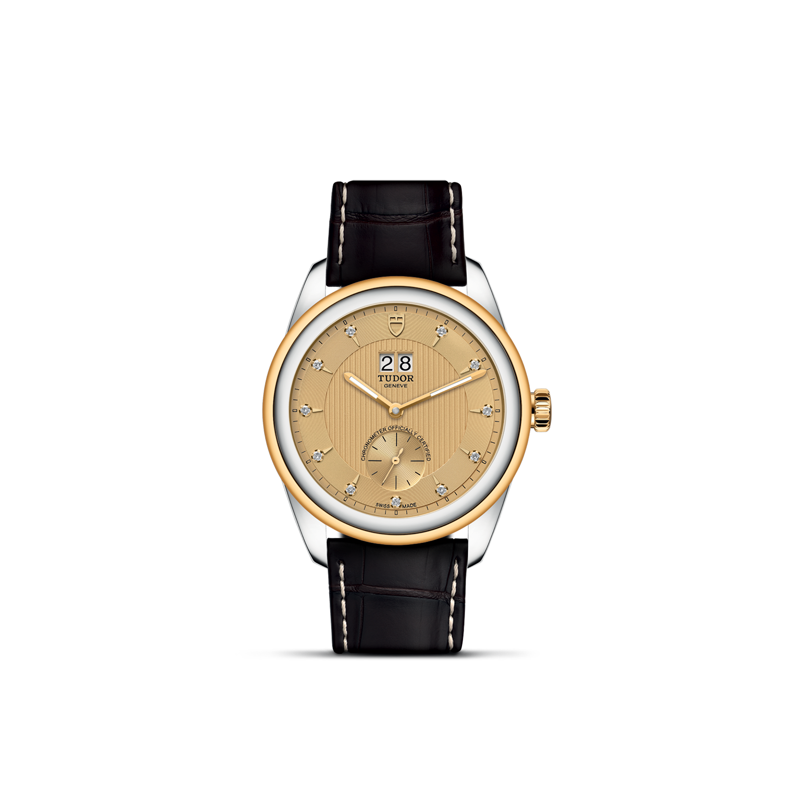 旋入式上链錶冠,饰以帝舵表标志;由钢芯及0.3毫米黄金包金制成