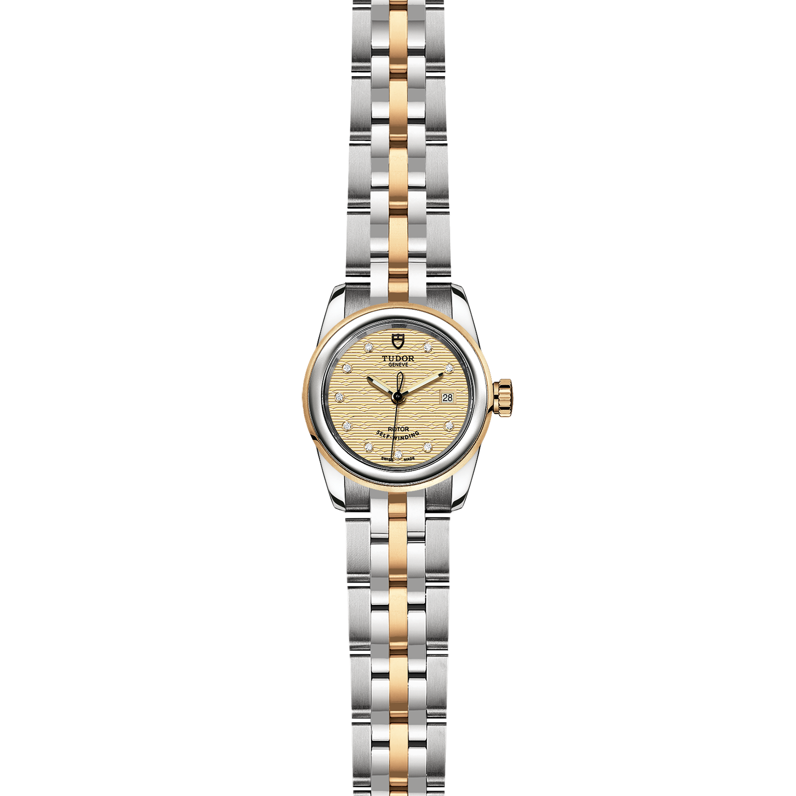 位于6点钟及12点钟位置的首节中间链节由实心黄金制成;其余中间链节由精钢或钢芯及0.2毫米黄金包金制成;摺扣及保险扣