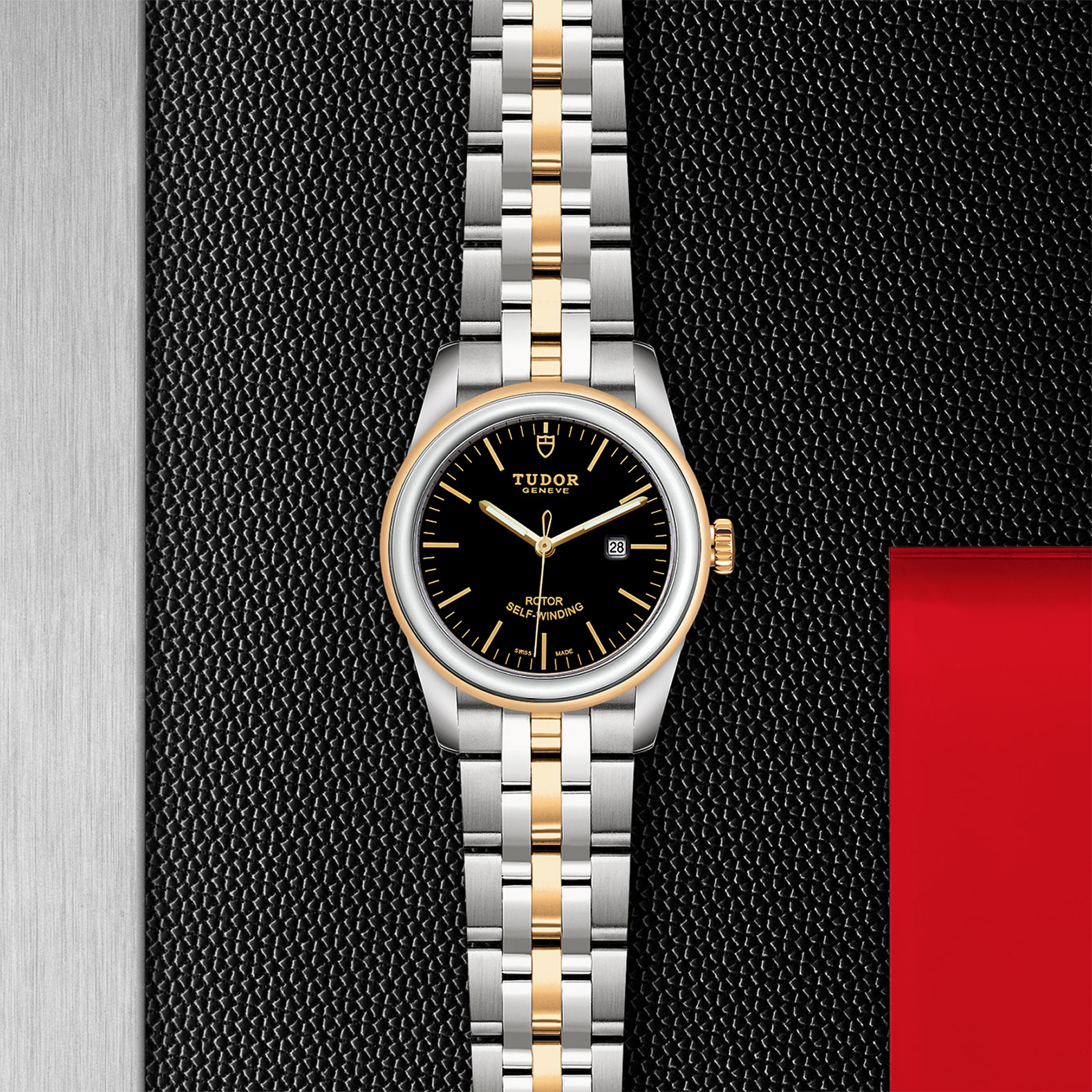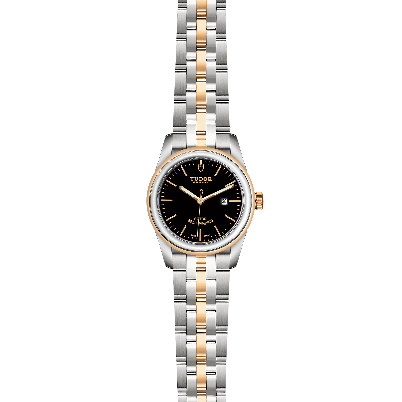 位于6点钟及12点钟位置的首节中间链节由实心黄金制成;其余中间链节由精钢或钢芯及0.2毫米黄金包金制成;摺扣及保险扣