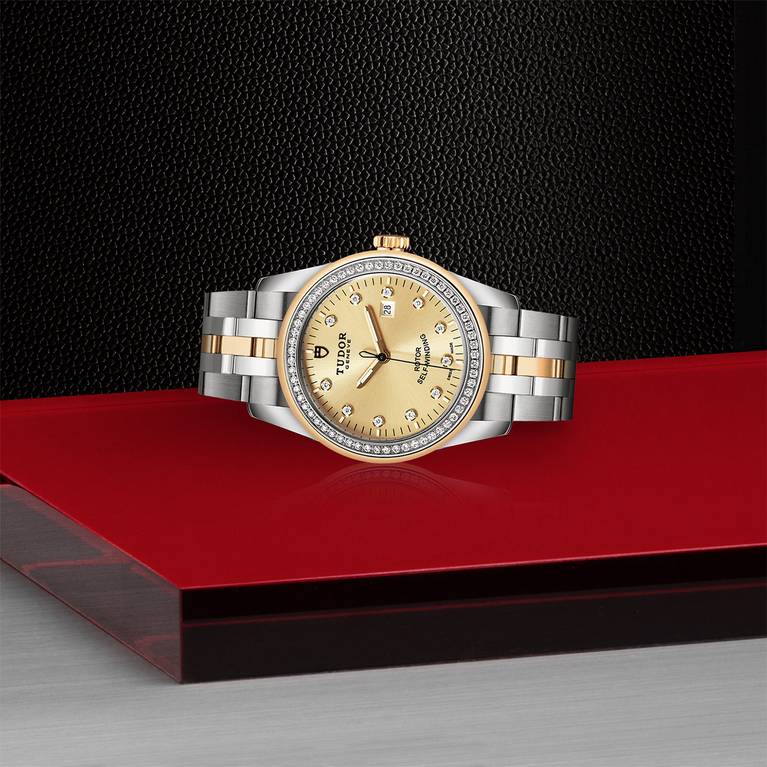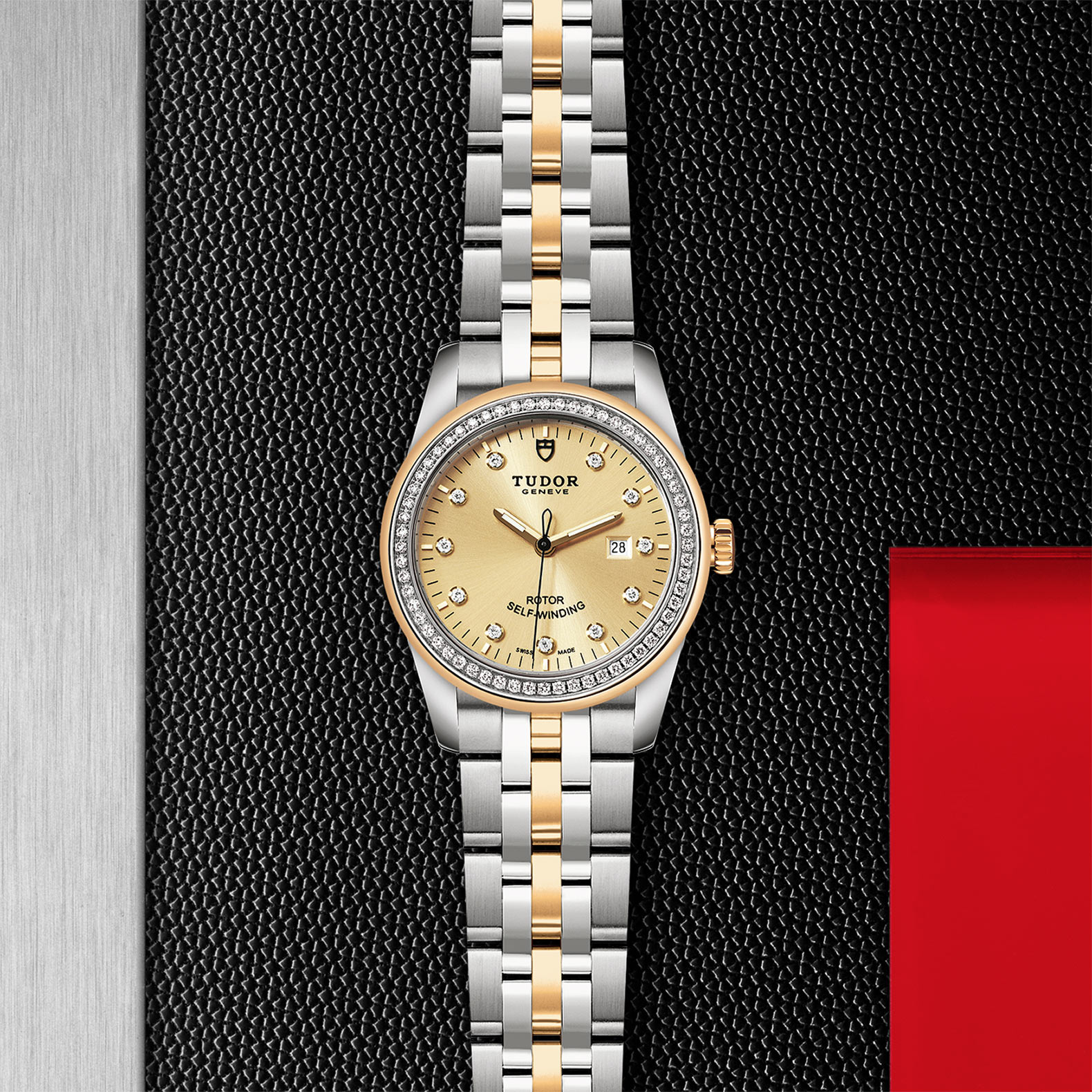 位于6点钟及12点钟位置的首节中间链节由实心黄金制成;其余中间链节由精钢或钢芯及0.2毫米黄金包金制成;摺扣及保险扣