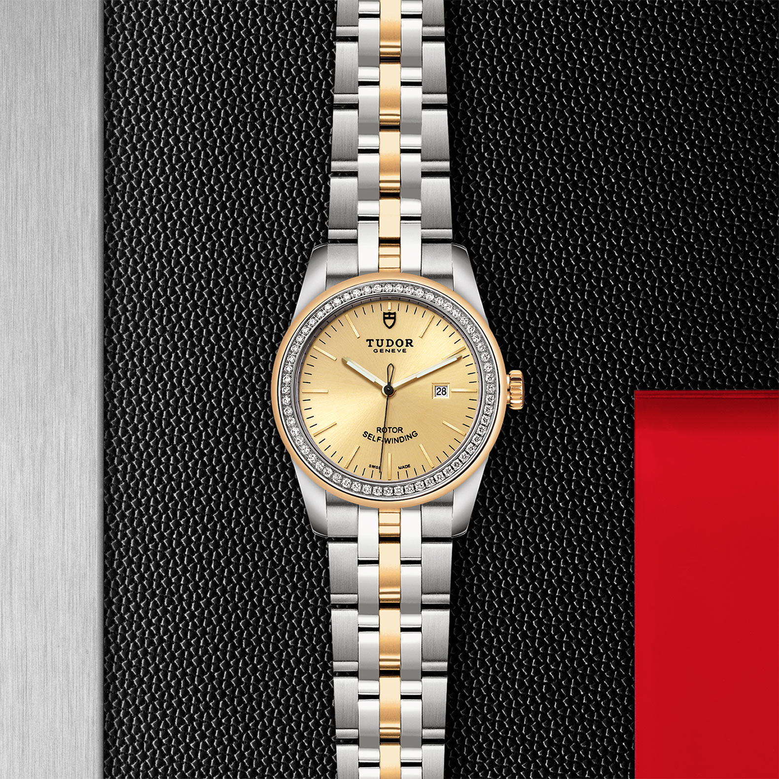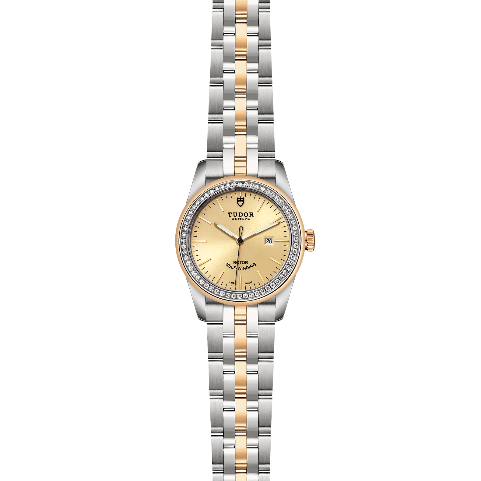 位於6點鐘及12點鐘位置的首節中間鏈節由實心黃金製成;其餘中間鏈節由精鋼或鋼芯及0.2毫米黃金包金製成;摺扣及保險扣