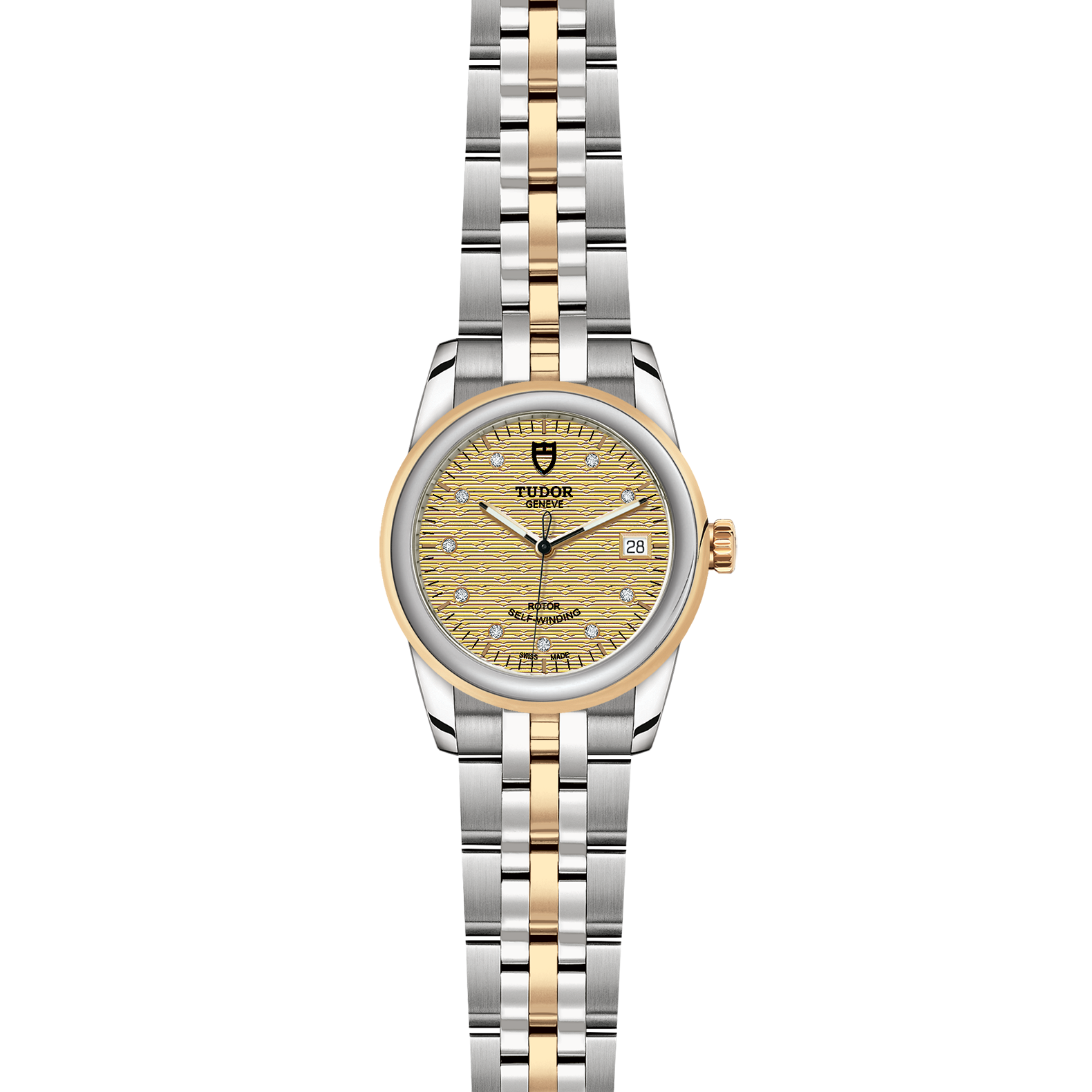 位於6點鐘及12點鐘位置的首節中間鏈節由實心黃金製成;其餘中間鏈節由精鋼或鋼芯及0.2毫米黃金包金製成;摺扣及保險扣