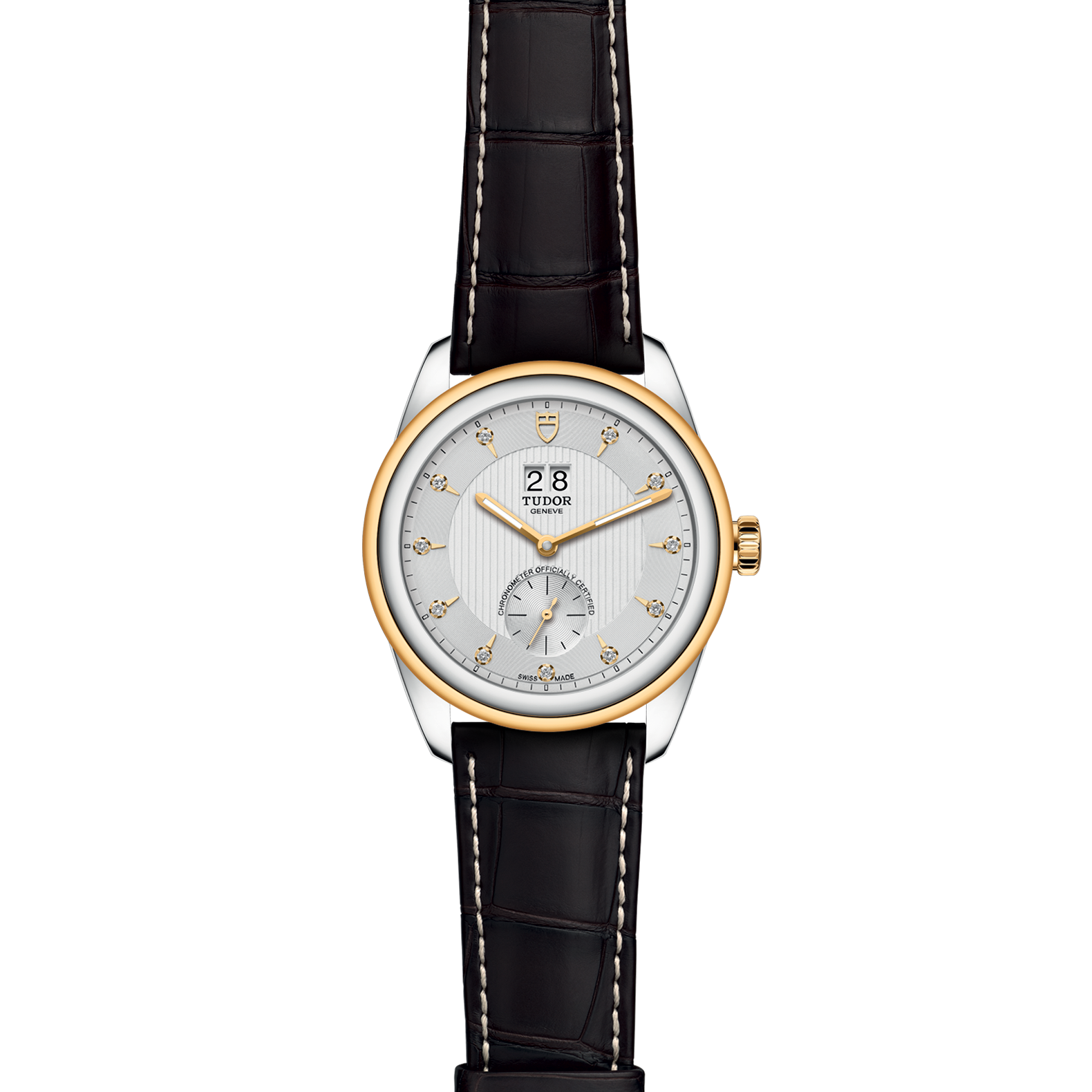 銀色配鍍黃金鐘點標記,鑲11顆鑽石